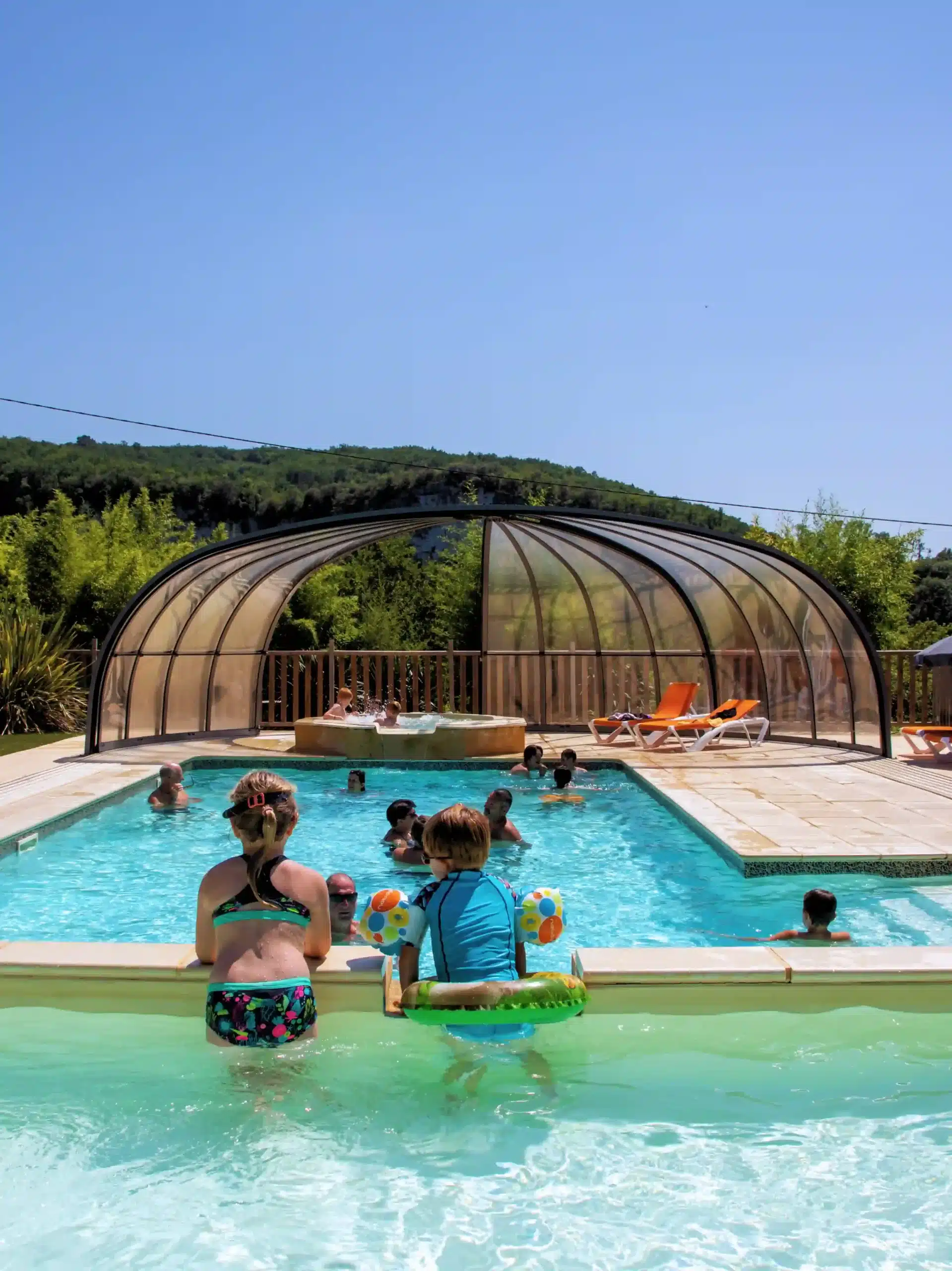 Toute la famille pourra ensuite se prélasser sur la terrasse, sur un transat au bord de l’eau et profiter de la vue magnifique sur les falaises et la rivière Dordogne.Un autre atout de notre piscine est son toit rétractable. Ainsi, même en cas de pluie, vous pourrez vous baigner sous un abri. Notre piscine couverte assure ainsi des moments de plaisir aquatique même par temps maussade lors de vos vacances en camping.