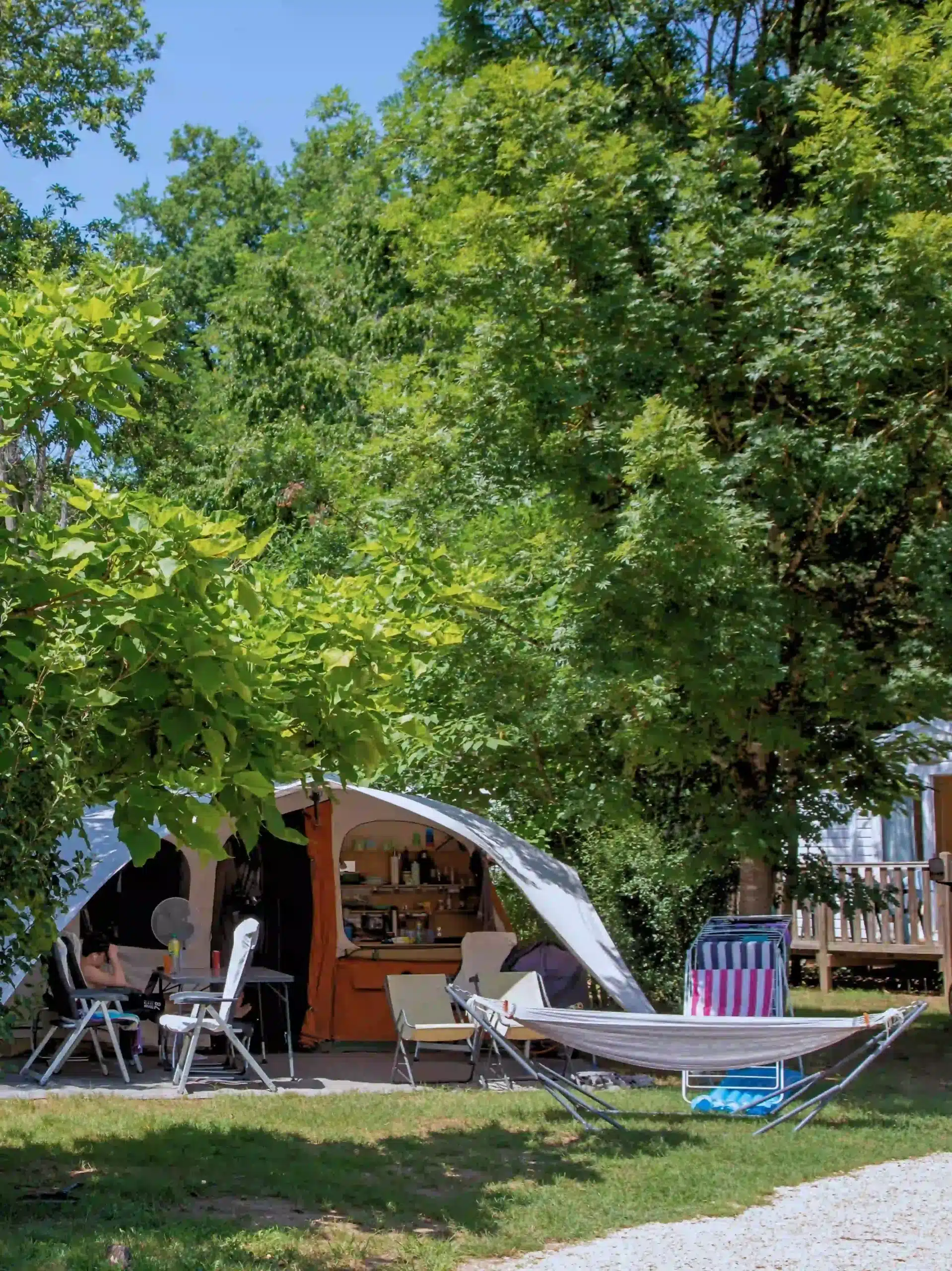Notre camping propose enfin des emplacements Freecamp uniques, conçus pour offrir une expérience de camping sur mesure. Pour les vacanciers qui désirent un confort optimal lors de leur séjour dans le Périgord Noir, la formule « Free Camp Guinguette » offre une salle à manger intérieure, parfaite pour les soirées plus fraîches ou les moments de partage en groupe. Cette option d’emplacement garantit intimité et commodité, avec un accès facile à toutes les installations du camping pour une expérience de vacances sans souci, en plein cœur de la nature.